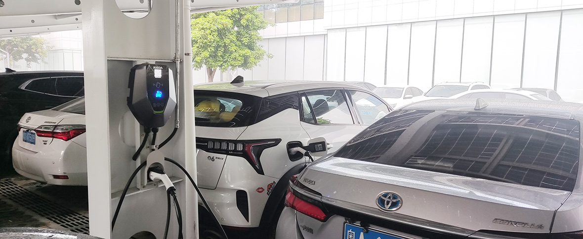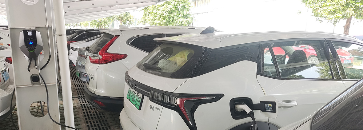车棚占地面积约700平米,覆盖52个标准停车位,安装13个7KW充电桩,可满足13辆车同时充电。