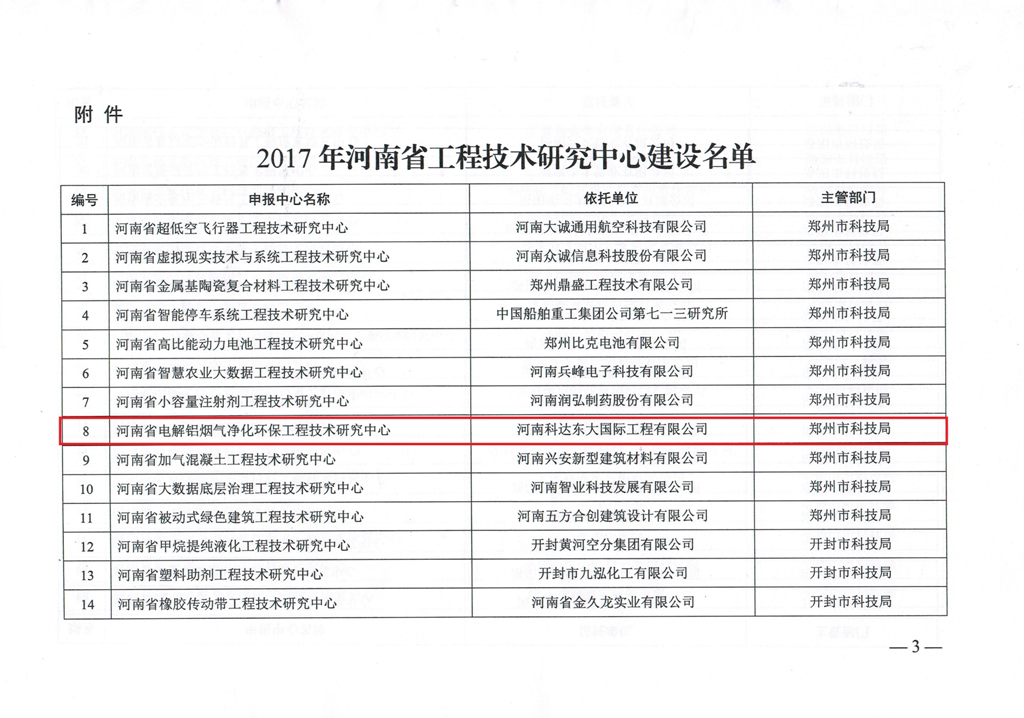 日前,河南省科技厅公布了2017年新认定的河南省工程技术研究中心名单,MK(中国)一站式服务平台东大申报的“河南省电解铝烟气净化环保工程技术研究中心”金榜题名,成功荣获“河南省工程技术研究中心”荣誉称号。
