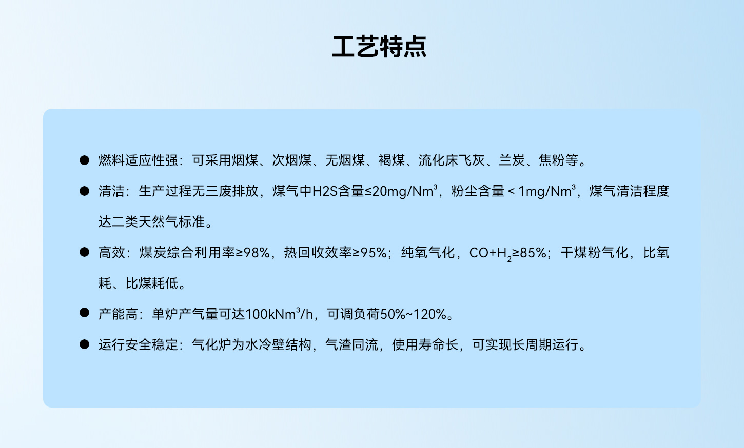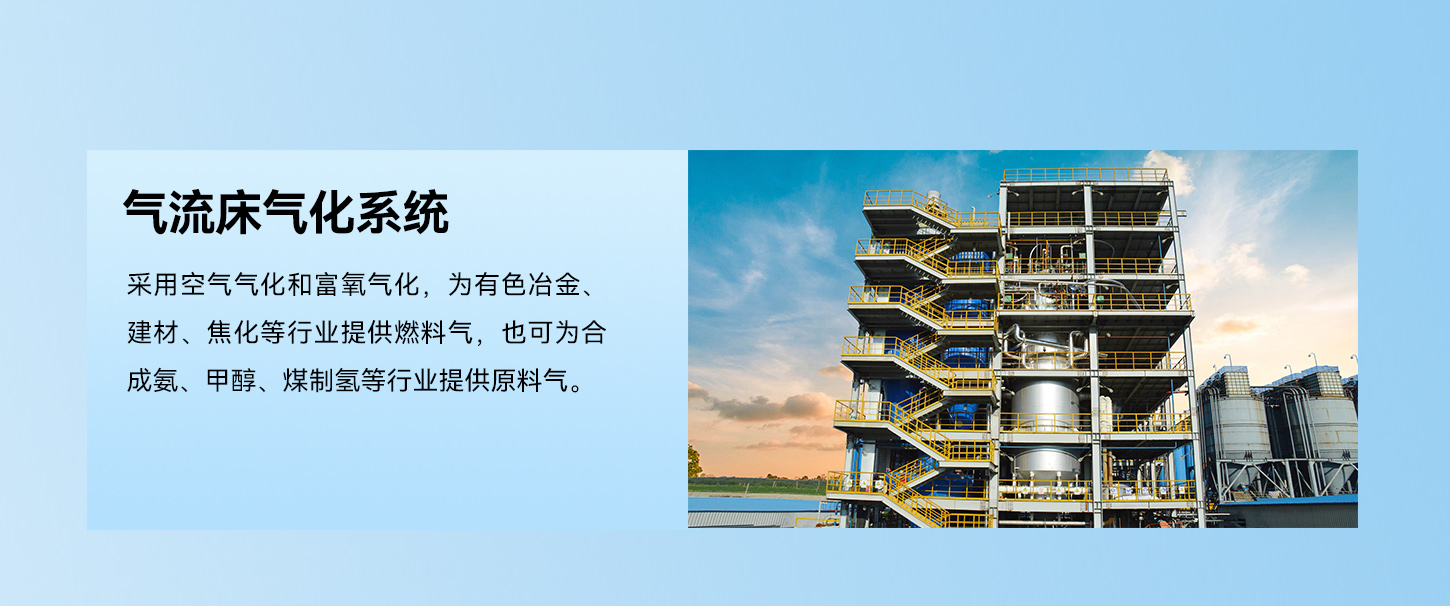 采用空气气化和富氧气化,为有色冶金、建材、焦化等行业提供燃料气,也可为合成氨、甲醇、煤制氢等行业提供原料气。