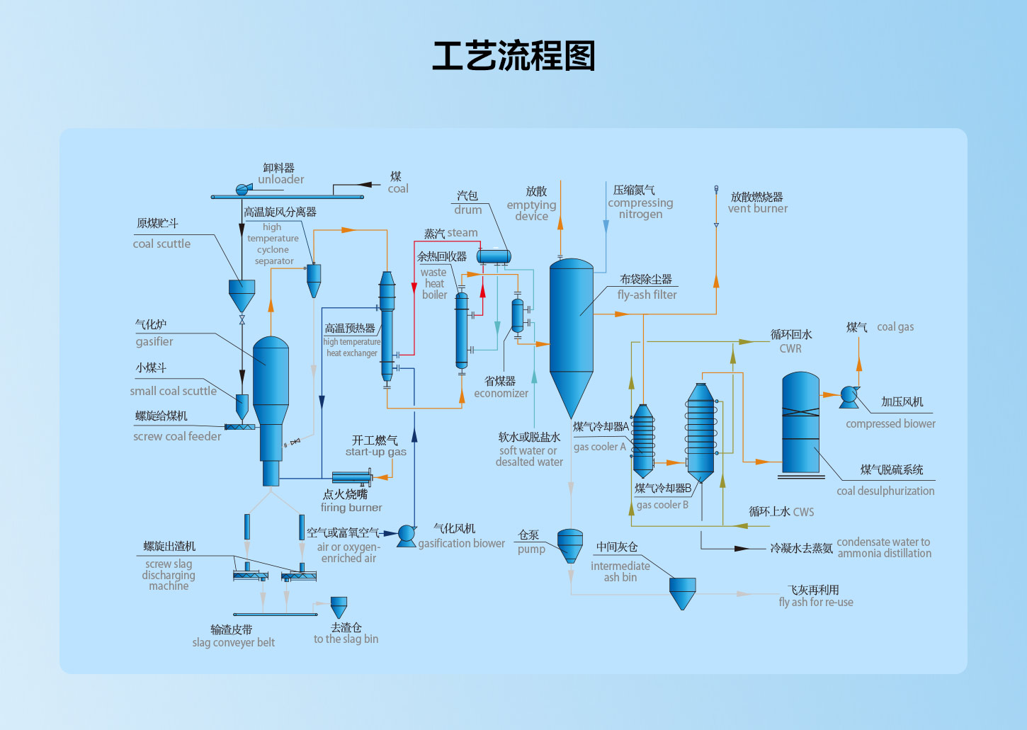 ● 清洁:生产过程无三废排放,煤气中H2S含量≤20mg/Nm³,粉尘含量≤10mg/Nm³,煤 气清洁程度达二类天然气标准。 ● 高效:采用全逆流换热可回收90%以上煤气显热;高温助燃技术可显著提高煤气热值。 ● 产能高:单炉产气量可达80kNm³/h,可调负荷范围广。 ● 运行成本低:使用碎煤,不必采用昂贵的块煤,显著降低制气成本。 ● 运行安全稳定:完善的安全保护连锁、一键停车设置;关键设备可在线更换维修,单炉最长运行周期超过12个月。